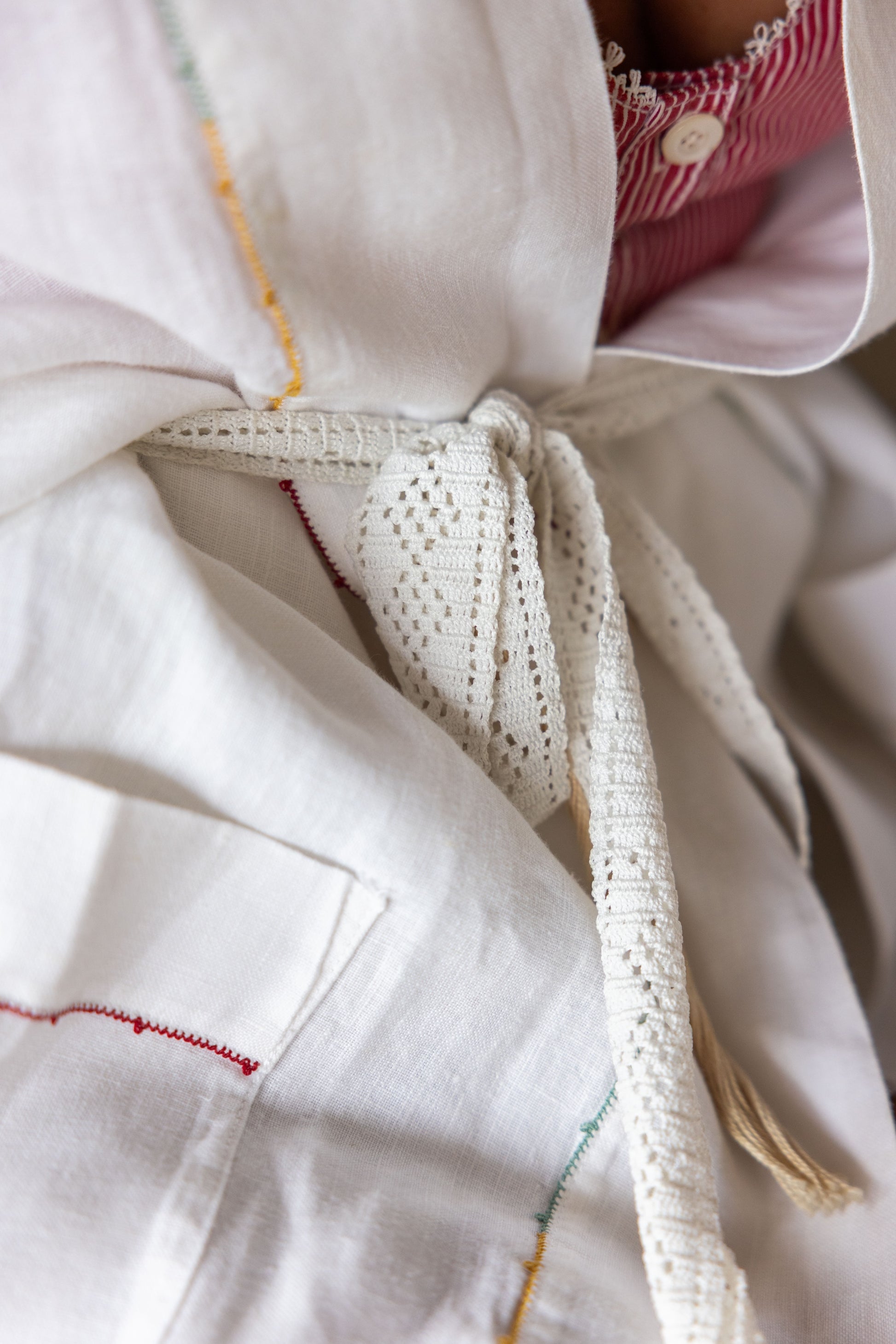 The Belt Ottoman is a luxurious and sophisticated accessory, hand-crocheted with fine detail and contrasting colors. This belt is inspired by a belt I found on an antique market in Istanbul. The original originates from 1850's ottoman time. Its intricate fringe adds a touch of elegance to your waist or neck, making it the perfect addition to any outfit. Elevate your style with this exclusive piece.