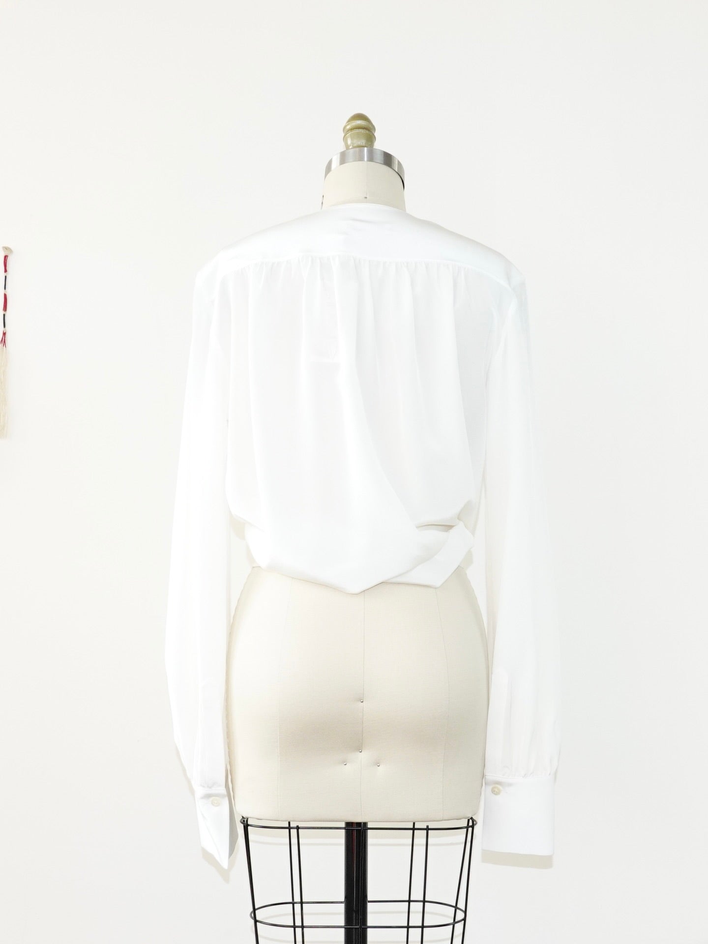 Blouse Braga is a very feminine cut wrap blouse. It has no buttons, it can be worn either tucked in, or casually knotted. Both ways it offers a very feminin neckline. This edition is made from finest 100% Cotton poplin. Featuring extra long sleeves with high cuffs.