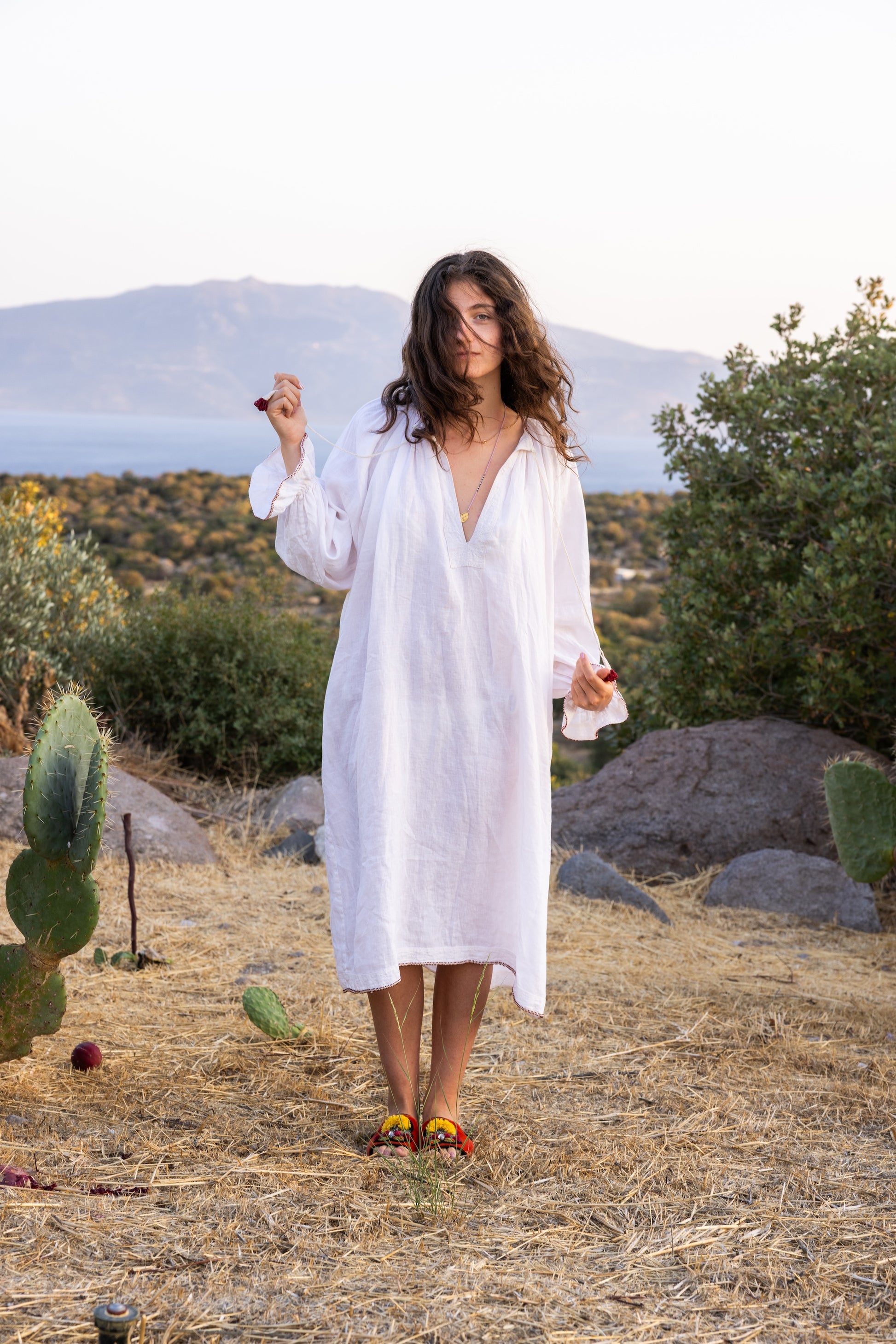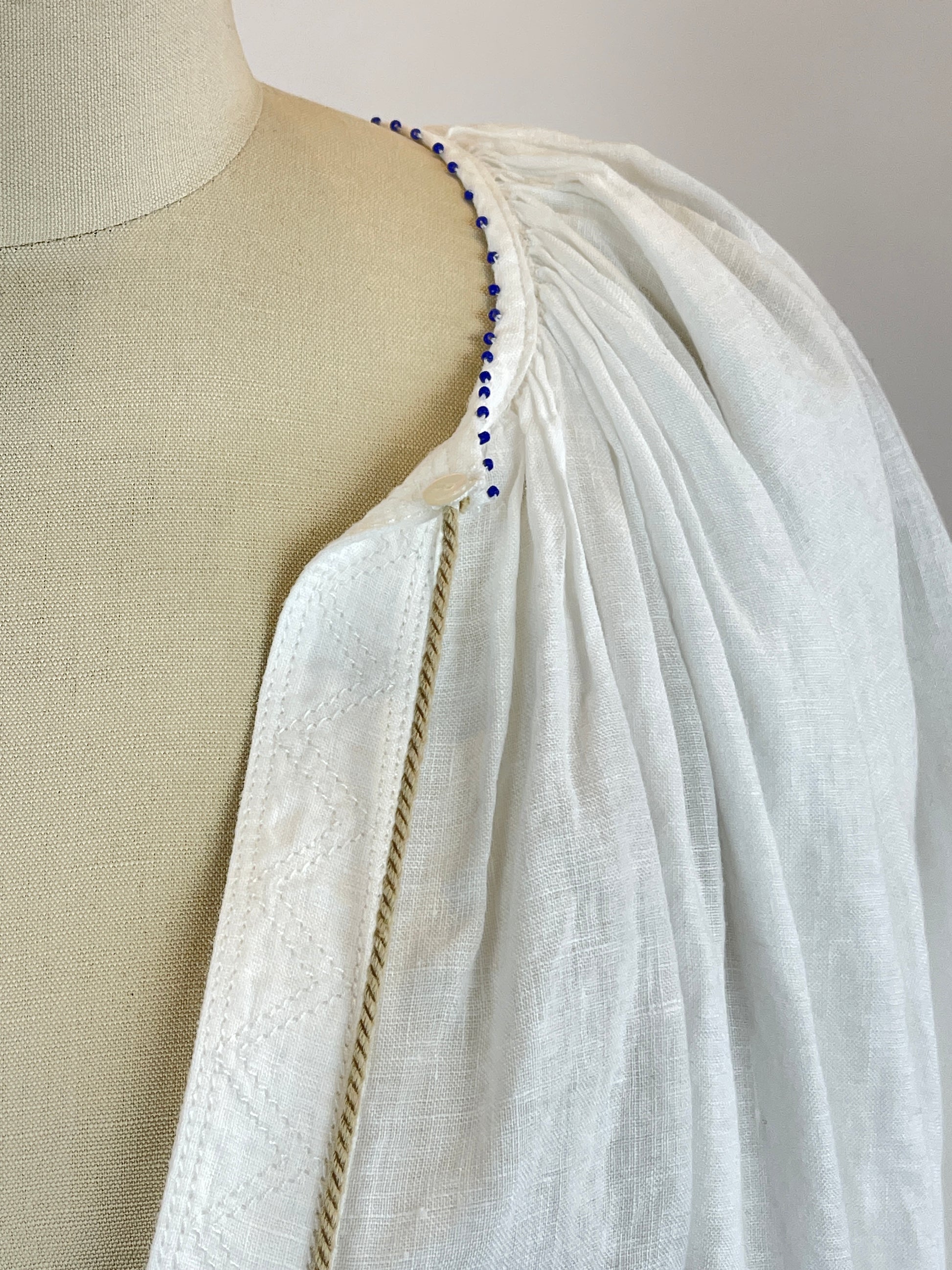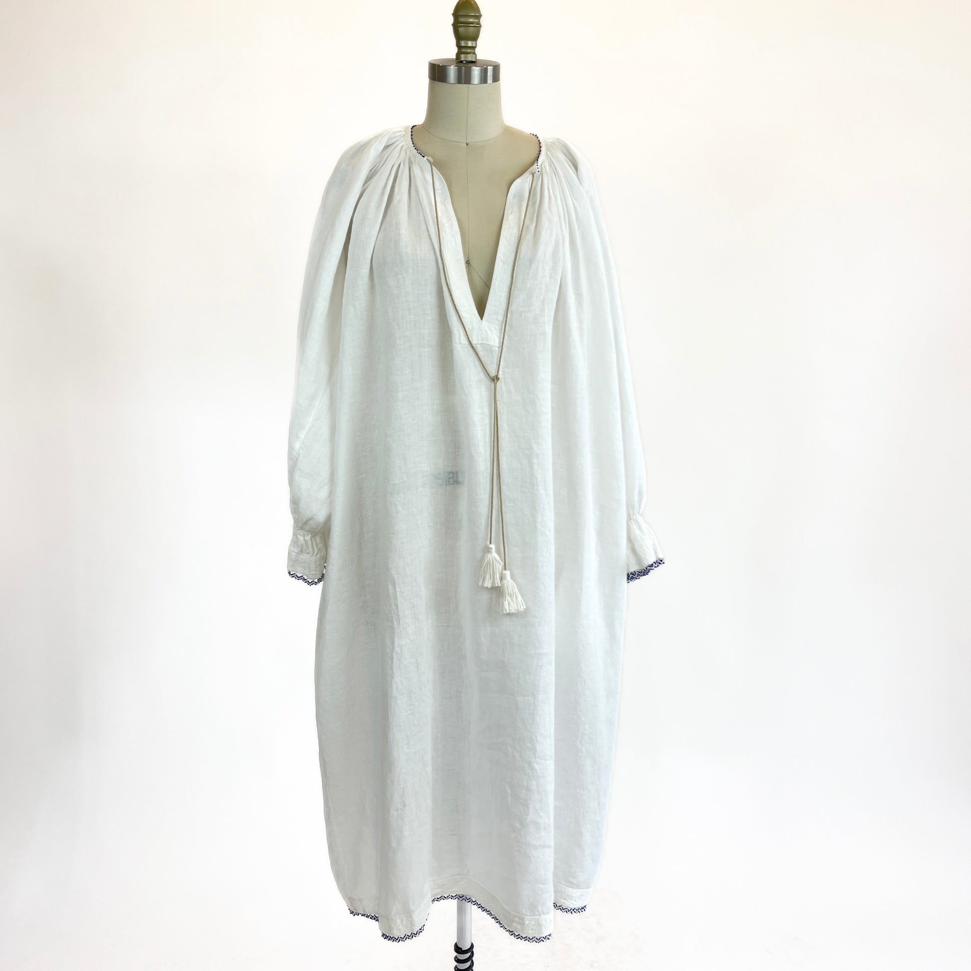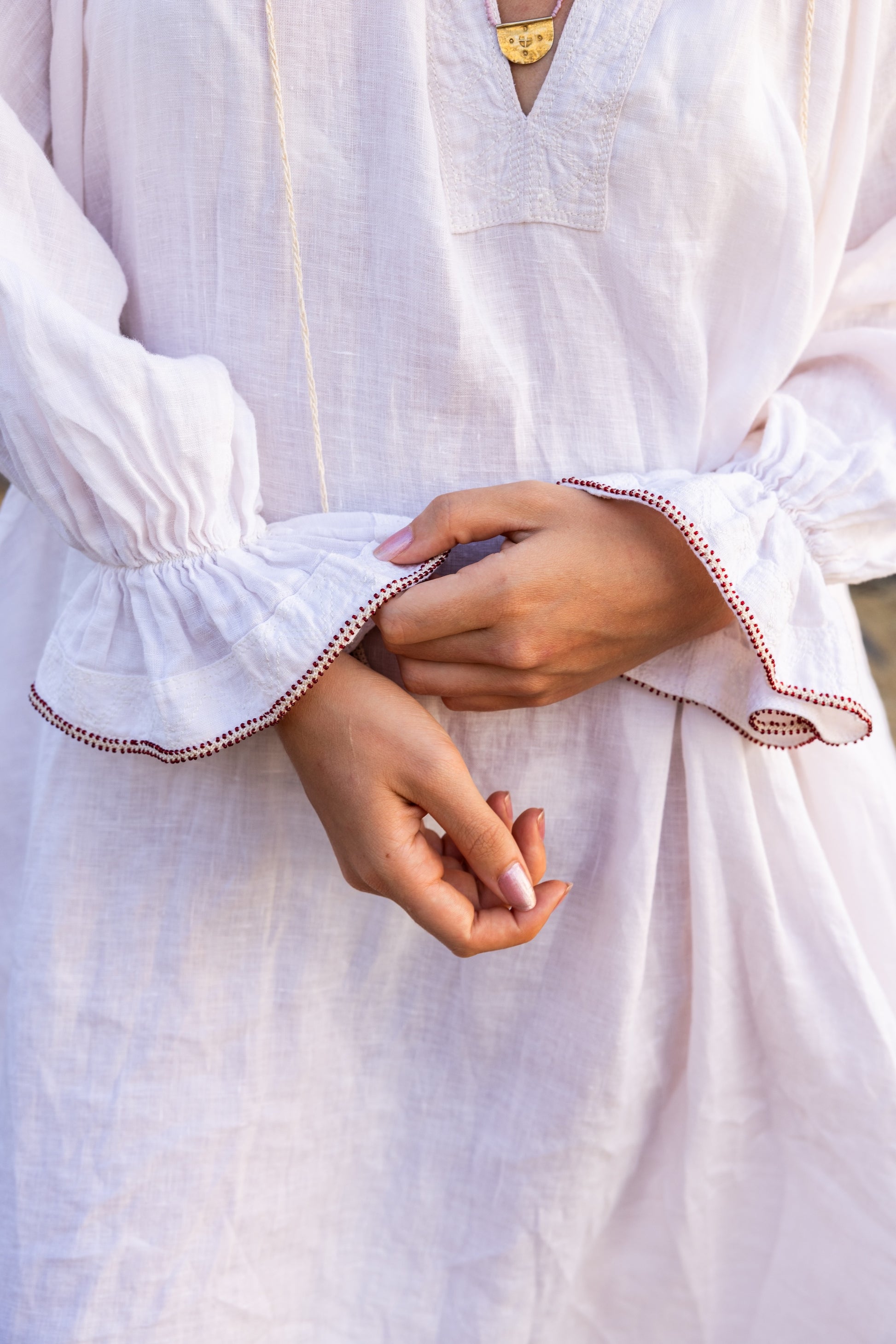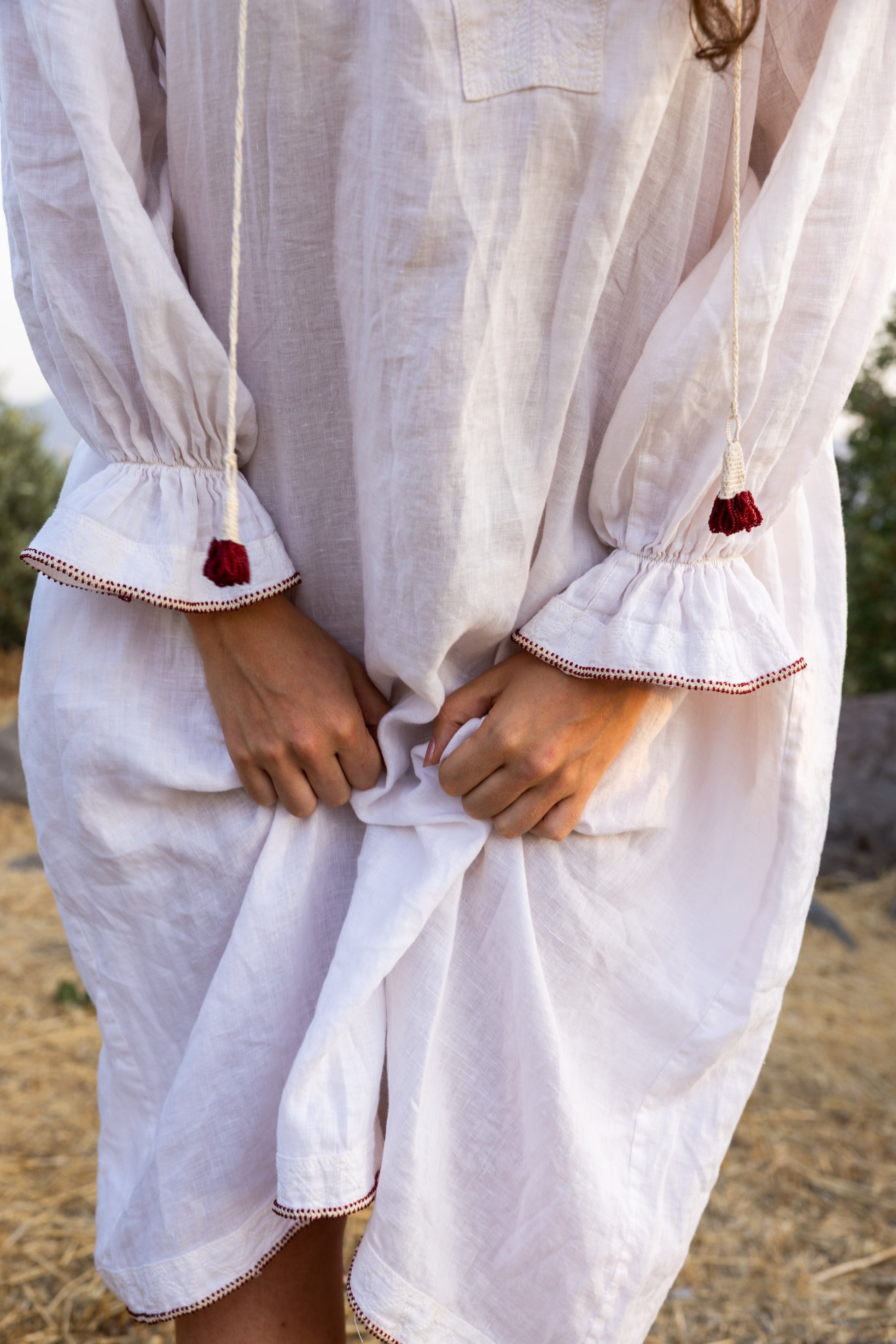 DressDaisy – White Linen, Handmade Details Crafted from 100% natural linen, this long version of DressDaisy features delicate beaded lace and removable tassels, fastened with mother-of-pearl buttons at the neckline. Each piece is made to order and customisable—available in different lengths and variations upon request.
