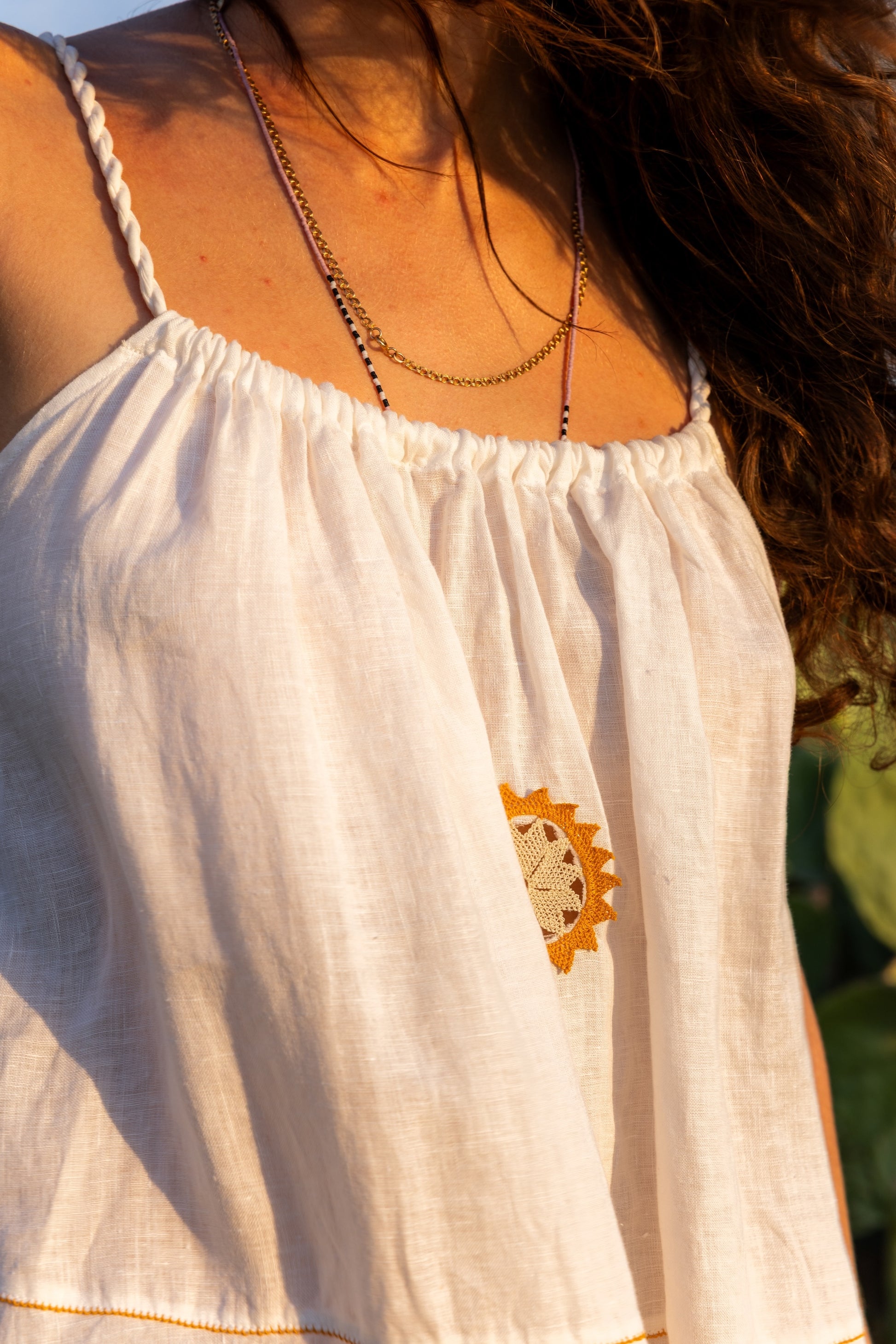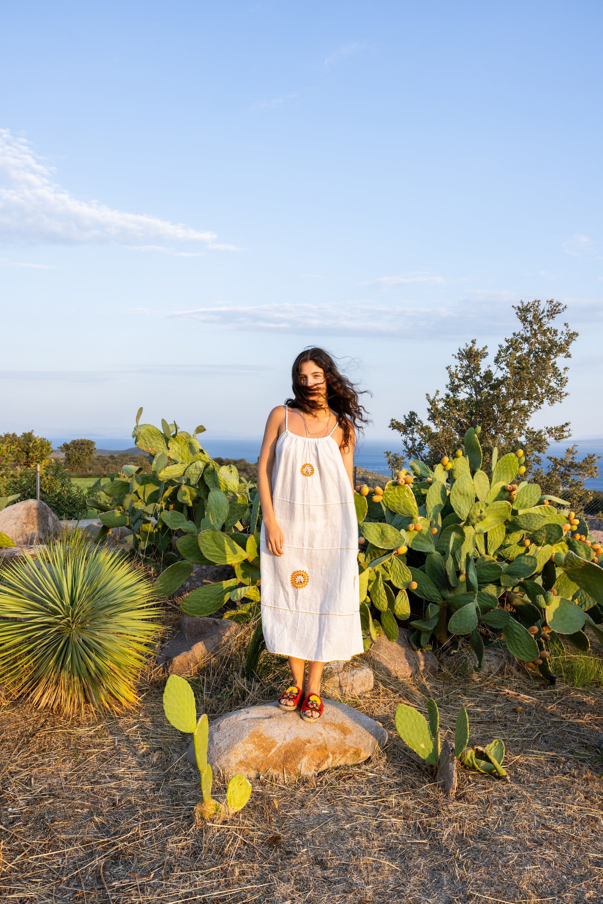 The airy sundress “Daphne” is cut from swathes of 100% lightweight linen, and falls to a tiered floaty hem. The neckline can be softly ruffled and adjusted to your liking with artfully braided straps. The strap length is adjustable so we didn't see the urge to make sizes.